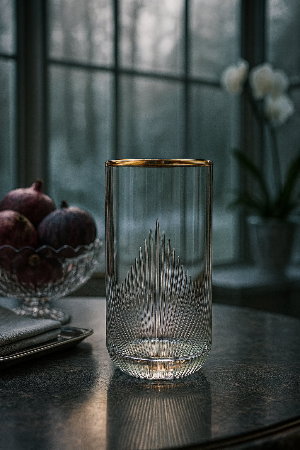 Tall, sleek, and endlessly versatile, the Ascend Highball is crafted for those who appreciate refinement in the everyday. With its elongated form, delicately cut vertical motif, and a graceful gold rim, it elevates everything from sparkling water to crafted cocktails.