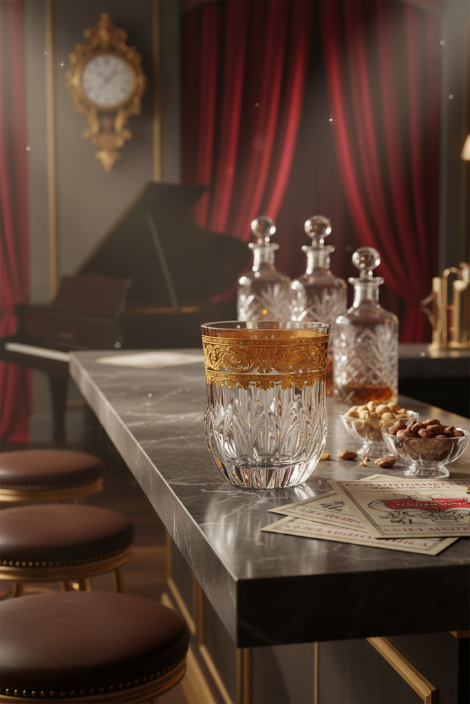 Where artistry meets indulgence, the Majora Tumbler embodies timeless sophistication in every detail. Its radiant glass body is crowned with an intricately embossed golden band — a motif of regal scrollwork that recalls the grandeur of classical ornamentation.